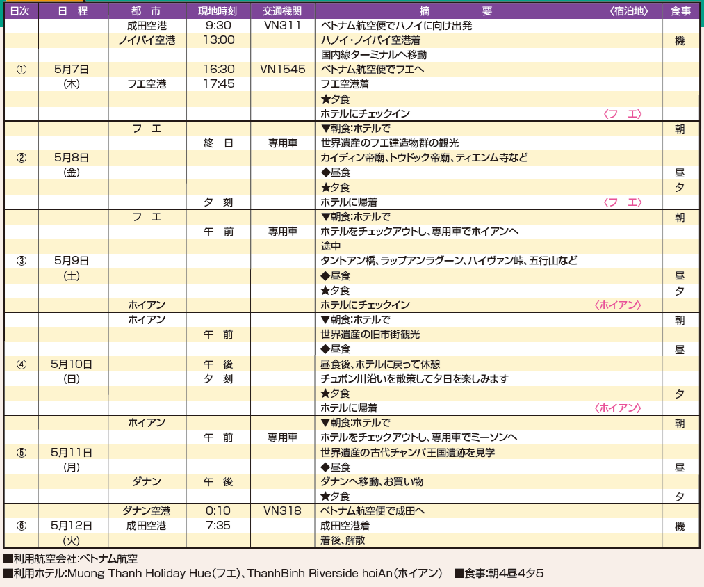 もに世界遺産の街に連泊し、ゆったりと観光します。5日目には古代チャンパ王国の遺跡・